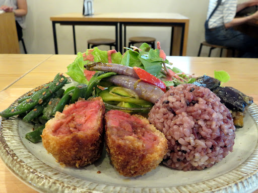 Read moreI lunched once here alone, enjoying a plate: beetroot korokke croquette with eggplant, bell pepper, salad... that was colourful, tasty, with a nice texture! Fruit water. Luminous, casual, quiet, friendly staff, 100% vegan, organic, healthy, fast service, takeaway OK, reasonable prices. Plants outside. A few tables, all with female clients that day. Kids & cane OK, not wheelchairs. Sanitary precautions: alcohol for hands at the entrance, staff wearing masks. Go before 12:30 for choice (that day's calzone was sold out). Also sells muffins, scones, vegan...