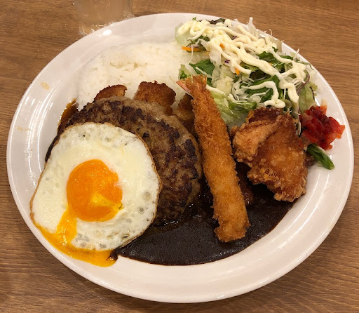 濃厚で甘みのある黒いルーの上に、うすカツ、チーズinハンバーグ、海老フライ、から揚げ、目玉焼き、サラダがのった豪華カレー。子供も大好きな料理がてんこ盛りといった感じです。