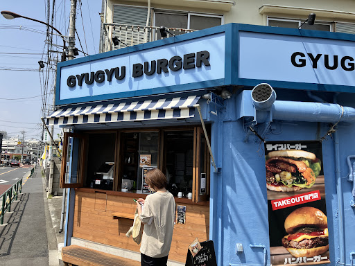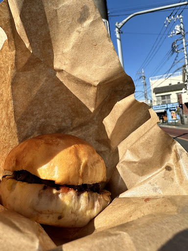 写真は少し離れたスーパー前でお店と撮ったハンバーガー、2枚目は仙川駅に戻って近くの公園で食べてるときのです(食べかけすみません)。