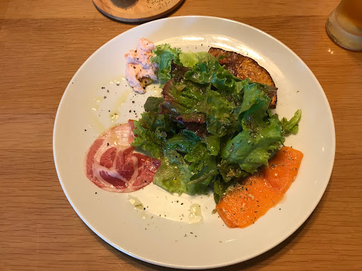 Read more口コミを頼りに、初めて来店しました。このエリアは自宅からそう遠くないのに、駐車場も沢山ないので、なかなか足を運ぶことはなかった。 新しいお気に入りのお店になればと期待して参りました。 店内入った瞬間に、わー居心地良さそう〜と感じました。 雰囲気良くて、オシャレな店内だが気取りすぎていない。 バーのようなアメリカンチックなような妙に馴染む居心地の良さに溢れている。マスターはまだお若そうだが、適度な距離感の接客は、なんの嫌味もない。お一人で切り盛りしているようだが、テキパキとこなしている様子。 注文はスマートオーダーシステムで、QRコードで読み取り注文する。 これも確かにスマートで、ワンオペには必須かもと思われる。 ランチのメンチカツセット1480円に、自家製ジンジャーエールを注文。 ジンジャーエール程よい生姜の辛味と甘さで美味い😋 ランチの前菜として出てきたプレートは、なんだかワクワクするような盛り付けで、ドレッシングも美味しいし、一品一品が程よくサニーレタスと合っている。小ちゃなパンもひとつ付いてくる。これが前菜だと思えば安いじゃないか。 十勝のモッツァレラチーズが入ったメンチカツは、衣がサクサクしており、油っこくもない。付け合わせのザワークラウトのような物も、酸味が強いがお口直しにサッパリとさせてくれて、相性を考え抜いたチョイスなんだと感じた。 ピザにうるさい相方は、マルゲリータのランチにしたが、これは合格だ💯と即座に👌 トマトのソースの酸味が強すぎないのが良いと。辛味はマリーシャープが出てきたので、これまた嬉しいと喜んでいた。安直なタバスコなんて出さない。 お料理ひとつひとつが丁寧であるし、手際よくお客様の様子を見ながら提供している。 あーもっと早くに来ていれば良かったあーー! これは夜も美味しい料理にありつけるんだろうなあ。アルコール類も豊富に選べそうだ。 雰囲気抜群、料理も丁寧で美味しくて高すぎる事もないなんて、 最高じゃないかあー! これからどんどんと通いたい、...