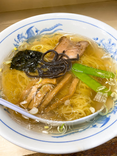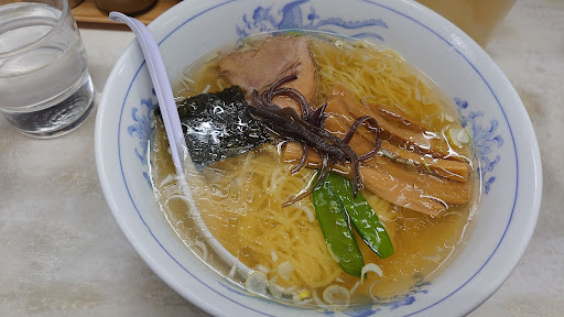 モンゴル岩塩を使用したラーメンは透明なスープに多加水のツルツルとした麺。具材の絹さやとキクラゲが懐かしいラーメンのビジュアル。スープは一口目は美味しいと感じるが今どきの出汁が全面に香る塩ラーメンとは違い塩味が全面に出てくるラーメン。出汁やコクと言うよりは万人がこのむアミノ酸調味料の味に感じた。かなり喉が乾く。