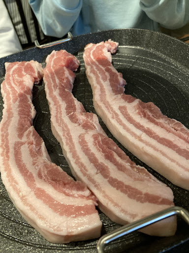 そうこうしていると、サムギョプサルのスタンバイ。全てスタッフの方が調理してくれます! 薬味は岩塩、ごま油、甘めの韓国ミソ、謎のきな粉のような粉。 包み込む葉物は、サンチュ、サニーレタス、エゴマの葉なとが盛りだくさん!個人的にはエゴマの葉が好きです!