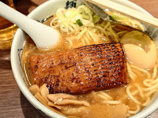 Read more浜松町と増上寺の通り沿いにあるラーメン店の一つです。とは言え、やや奥まった建物の1階にあり、通り沿いに設置された看板が無ければ、そこにラーメン店があると気づく人は多くないかもしれません。それでも昼夜及び平日休日問わず混雑しますが、客の回転は悪くなく、列に並ぶことになってもすぐに入店出来るでしょう。 入口にある券売機で事前に食券を購入する必要があります。カウンター席・テーブル席併せて30席弱で、店内は狭く(カウンター席後ろの通路は、何とか人一人が通れる程度の幅です)、入口には段差があるため、車椅子等の障碍を持つ方の利用はお勧めできません。 ラーメン及びつけ麺が主なメニューですが、特徴的なのがトッピングの大きな角煮です。外側は柔らかく噛むとすぐに肉が解けますが、内側は少し歯応えを残した作りになっています(勿論内側までしっかりと過熱されています)。麺によく絡むスープも濃厚で、ガッツリ食べたい人にはピッタリな店だと思います。