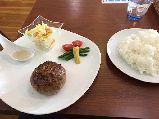 Delicious hamburger steak (ハンバーグ). I got mine with a kind of salt jelly (塩ジュレ)to accompany my hamburger. They went perfectly together, very delicious. The owners were...