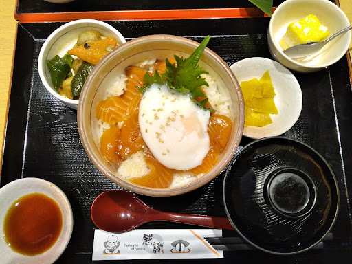 Read more900 yen for a full set meal :") it looks healthy, it felt healthy after finishing the meal as well lol salmon rice bowl with hot miso soup and side dishes, added with little tasty dessert, oolong tea iced drinks are also provided at the beginning when they took our orders. Absolutely...