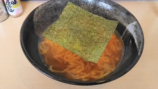 黒い丼には、オレンジ色ががったスープにオレンジ色の中太ストレート麺が沈み、最初は見えませんが、刻みねぎと糸唐辛子が載り、焼き海苔が被せてあります。