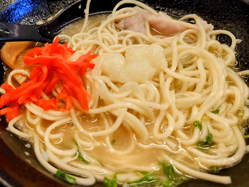麺 白色がかった、細いストレート、 加水率が低く、茹で加減は浅めで、 九州ラーメン、かためと普通の中間くらい?