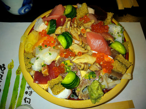 とにかくお店はきっちりと清掃が行き届いていて店内入ったら美味いって分かるオーラ もちろん接客も非常に丁寧で回らないお寿司さんなのにアットホーム メニューを一通り眺めスタミナ丼に決定。早目の朝食でお腹ペコペコなのとお寿司さんでは珍しいスタミナの文字、ところが大間違いだった街のお寿司さんだから大盛りもペロッと食べられるだろうで出て来たのは😲 なんじゃーこりゃー💧 ご飯ばっかりの大盛りとは違い具材もめちゃくちゃ大盛り普通の丼なら4杯分くらいの量、入ってる具材もお高い物がゴロゴロで本物の宝石箱になってます とにかく中枢神経系がこの量を悟る前に最悪の事態を想定しながら具材を多めに食べ進みます。同行者に救援を頼みながらもう少しのところでデザート。その分のシャリは残させて頂きました😅 恐るぺしスタミナ丼、まさか食べきるのにスタミナが必要な丼とは思いませんでした(笑) 大将のおフザケは半端ないので次回から普通サイズで頼みます