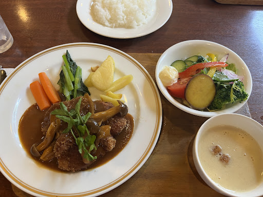 If you're looking to travel back to a restaurant experience in 70s Japan, this is your place! The decor and menu (and even some of the friendly staff) seem to have been frozen in time. The lunch sets usually offer pork, beef, fish, and spaghetti, but there's an a la carte menu. Set prices are 1200-1800 but volume and taste are good. Minuses are no English, it's pretty out of the way, and lunchtime can be busy with the...