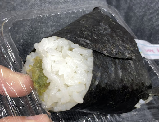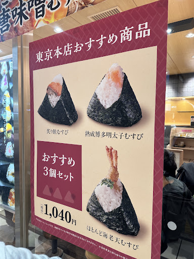 Handmade onigiri rice balls with an array of fillings at a simple snack bar with counter seating.