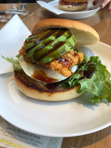 I always order the teritama burger. It is delicious and honestly the best bang for your buck. The bagels only have cream cheese on one side so I never order them because it seems so little compared to what I’d normally get back in the states. The bagels don’t taste like traditional ones, more chewy and soft,some of my friends prefer them more but I like the harder New York style bagel personally. I love all the seasonal bagels they put out, especially during the holidays you’ll see Santa and snowman bagels. I usually will grab a few bagels to go after eating in and freeze them so I can enjoy them throughout the week. Some staff know English and it’s definitely family friendly (baby chairs and changing table bathroom). Overall hoop knows it’s demographic which is why it’s...