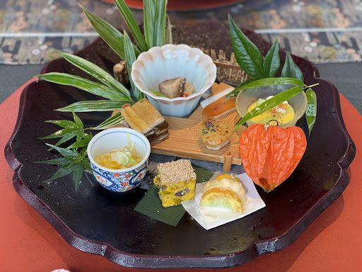 【八寸】 穴子の煮凝り 椎茸 柚子 白玉蜀黍の擦り流し 霰夏野菜 美味出汁ジュレ 里芋フォアグラ味噌田楽 シブレット ズッキーニの海老真薯挟み揚げ 山葵塩 自家製唐墨 金糸瓜のマンゴー酢和え 田楽胡瓜雷干し ほうずきサーモン寿司 南瓜松風 レーズン 木の実 凍み豆富と近江蒟蒻の旨辛煮 いんげん 白胡麻