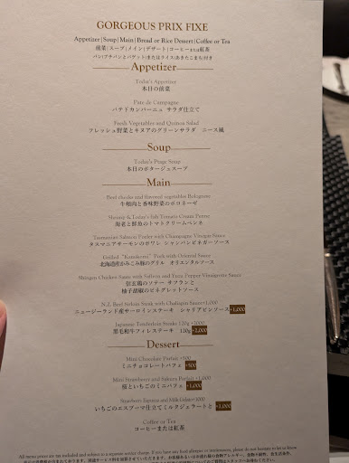アフタヌーンティーの体験がよかったのでディナーもよさそうと思いプレフィックスゴージャスディナー+フリーフローのプランを頼んでいましたが、当日メニューを見てデザートが別料金扱いになっていてあれっと思いました。