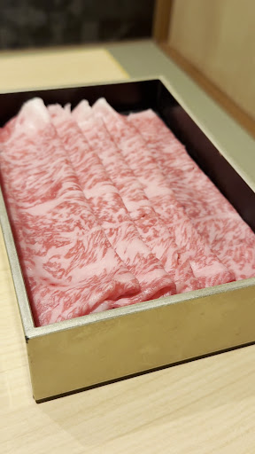 Here’s the lowdown: Sakura-Scented Sesame Tofu - 2/10 - Yeah, this one was a miss for me. Didn't quite get the hype. Seared Spanish Mackerel with Fragrant Ponzu Jelly - 8/10 - Solid. The mackerel was nicely done, and the ponzu jelly had a good kick. Steamed Egg Custard with Creamy Yuba (Tofu skin), Topped with Shark Fin Sauce - 8/10 (Wow factor: 10/10) - Okay, the shark fin thing was a first. Definitely a "whoa" moment. The custard and yuba combo was pretty interesting too. Wagyu Fillet Seared Sushi - 9/10 - Seriously tasty wagyu. Melty goodness. Though, gotta mention, the server did have a bit of a clumsy moment with the door. 😬 "Dashi-shabu" - Interesting - This was different from the usual hot pot vibe. Dipping in that dashi onion sauce was a new one, love it. Meh for the ponzu sauce for the wagyu. Brand pork - Loved it. Really good flavor. Snow crab - Meh. Didn't do much for me. Wagyu beef - Also just okay. Expected a bit more. Seasonal vegetables and mushrooms - Lol, it was one lonely mushroom. Not exactly a veggie feast Udon noodle and curry powder - 10/10 - Surprisingly good and super filling. Definitely hit the spot. Matcha Pudding - 11/10 - Seriously good. Really, really good. Could have eaten another one. Matcha - New experience - Traditional Japanese tea ceremony style. Definitely more bitter than the matcha I'm used to (usually with oat milk as matcha latte with fuck tons of syrup in the States). Glad the server gave those cute little rock candies though! Overall: Hyoki Shabu-shabu Akasaka had some definite highs, like that mackerel and the matcha pudding. The "Dashi-shabu" was an interesting take, and the pork was great. But some dishes just didn't quite land for me. A memorable meal with a few...