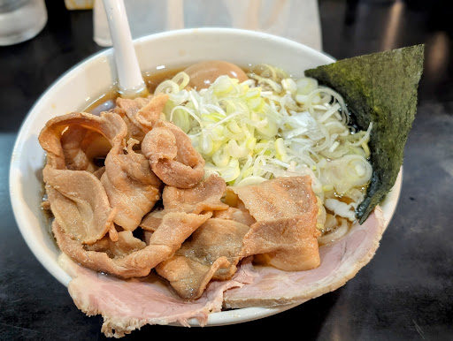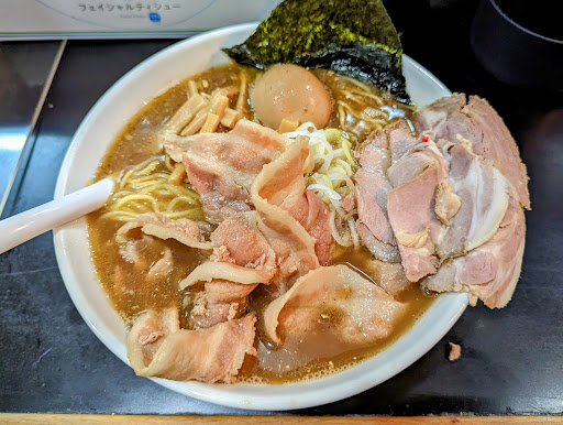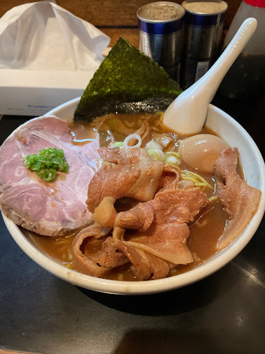 Definitely one of the uglier bowls lol. I honestly didn't know what to order here. On ramendb, the 100 seemed to be the bowl to get so I went with it. I only learned afterward by reading ramenguidejapan's blog post about the meaning of all the menu options. The 100 bowl that I got contained no tare at all, just the broth by itself. After you pick the variant, the owner will ask you at the counter for the broth you would like. He then presents you with 2 saucepans and lets you get a lil sniff, one with a chintan clear broth and one with a kondaku mixed broth. As you can see, I went with the kondaku here because it does seem more like an adventure. And for what it is worth, this kondaku broth was incredibly flavorful even without any tare. I wasn't quite fond of the noodles and the toppings. They were quite dry and these pork belly strips were surely a weird topping choice. It seemed like an extremely popular shop among ramen heads so ig I'm still a nub...