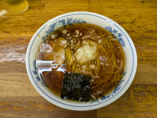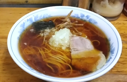 深夜までやっている八王子ラーメン店。席はカウンターのみで10席。駐車場はないので近くのコインパーキングへ停めることをお薦めします。23時30分過ぎと言った時間と歳末だからなのか、お客さんは全員飲んだ後の締めの一杯をすすっていた。満席だったので、オーダーをして約5分後には着席。今回は、初訪問だったので、基本のラーメン650円を注文。4人分ごとに麺をゆでるみたいで、先に注文したのにもかかわらず、ラーメンが出てくるまで10分近くかかっていた。でてきたラーメンは、シンプルな八王子ラーメン。薄切りのモモ肉チャーシュー、シナチク、のり、玉ねぎのみじん切りのラインナップ。当然ながらネギは入っておらず、ネギが欲しい人のためにカウンターにネギのみじん切りが置いてある。チャーシューがペラペラでシナチクも申し訳なさそうに少ししか入っていなかったので、トッピングのボリュームを求める人は、チャーシュー麺をお薦めします。 スープはあっさり醤油味で化学調味料は普通に使っているようだ。麺はストレート細麺で、スープとの相性は悪くない。第一印象は、飲んだ後のラーメンでショッパイ味付けなんだろうなと思ったが、以外と濃くなかった。八王子ラーメンが、500円台がスタンダードプライスのなか、八王子駅近くで深夜営業のためか650円と少しお高め。トータルバランスとしては悪くないが、八王子ラーメンとし...