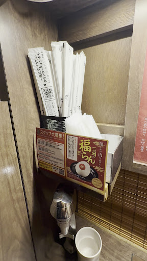 Once done, you will be directed to your seat 🪑and await the noodles that you ordered to be serve 💁♂️. At the booth, you are faced with a drawn bamboo 🎋curtain and whoever is at the other side will be busy cooking 🧑🍳👩🍳 it for you. You have everything you need right in front of you. Water dispenser 🚰, chopsticks 🥢, spoon 🥄…..etc all there. There are even 4 wooden 🪵drop tags 🏷️ to inform the staff of more complicated matters if you can’t speak Japanese 🇯🇵. (See my pics)