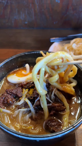 カレーの中に調合バランスの難しそうなラーメンスープの味を感じる そして元々、カレーも牛すじのどちらも好物なので、この組み合わせは嬉しい そして麺は、食べ応えのある太さで、麺の味も凄く良く、麺のコシも強く、食べ応えが好印象。 もしかして、麺が出来てからそれに合わせるスープを作ったのではないのかと思ってしまう程、麺の印象は強い 麺が美味しく、スープも美味しくて、帰り道は気分が良かった 難点を敢えてあげるのであれば、提供時間がかかってしまう所 うどんとはいわないが、そこそこに太い麺であるが為、仕方の無い事だが、その辺が改善するなら、文句が無いと思われる。 茹で方に更なる工夫が備わるならば、回転率も上がり…と、これは余計な話 客の待つ時間…ゆとりがある時しか選べないかな。本日はゆとりを貰っていたのがあり、問題なかったが、ゆとり時間が無い時は選択肢に入れられないかな。やはり敢えての難点である 見ていないがやっているのかも知れないが、ビックリ水とかで早く上がらないかな?と余計な事を考えてしまう。 とても美味しく、味で楽しい時間がとれました。