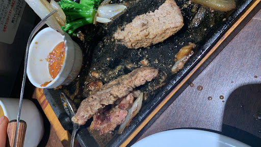 が、ナイフを入れた瞬間、なんだかかたい。 スジがある感じ。あれ?ヒレなのに。 そして一口食べて、肉の旨みがまったくない、、、 逆に少し臭みがある、、、 今までヒレを食べていても灰汁のようなドリップはほとんどなかったのですが、今回のものは食べた後の鉄板に灰汁のようなもの(多分ドリップが熱で固まったもの)が残っていました。 オーダーカットをやめてあらかじめカットして冷凍してあった冷凍肉を雑に解凍したために、旨みが肉から逃げたものを提供されたのかもしれません。 同じくヒレをオーダーした夫も同じ感想でした。