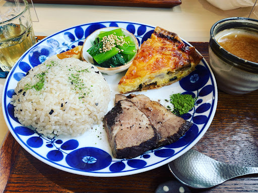 Read more平日13時過ぎに訪店。 Tシャツ展開催初日で搬入の人たちが大勢店内にいた。 店主に声をかけてやっと着席できた。 お茶づくしランチプレートを注文した。 まず常温の黒豆茶が出された。女性に優しいタイプのお店かしら?などと思いつつプレートを待つ。 おぼんにプレートとあちちなお味噌汁が乗せられてやってきた。本日からTシャツ展なのでご飯がTシャツ柄だ。可愛い。 コーンとじゃがいものキッシュはしっかりした味の生地に具がぎゅぎゅっと詰まっており、食べごたえあり。 2枚乗ったチャーシューは紅茶で煮てあり、トロトロでご飯にとても合う。 Tシャツ柄のご飯もお茶で炊いてあり、まさにお茶づくしだった。こちらはサッパリとしている。 こういったお洒落なお店にありがちな量が足りないということもなく、男性でも満足できそう。 黒豆茶はおかわり可能。美味しい。