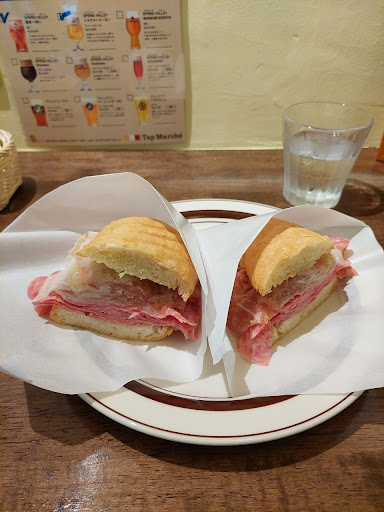 私、ハムの知識がないので、パッと見て生ハムくらいしかわかりませんでしたが、3種類のハム?のようなサラミのような?得たいの知れない美味しいハムみたいなハムがどっさり挟まってました。 自分で得たいの知れないハムの説明をしていてアホだなと思いますが、まさにそれなんです。笑
