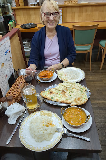 Staying nearby and checking out places for dinner. Most restaurants on Google maps had all the menus in Japanese only and we were intimidated by that. We found this spot nearby and figured that English would be easily understood in an Indian restaurant. It was. The restaurant is off the main roads by a block or so in a non-descript neighborhood but it was only a 5 minute walk from the hotel. There are about 6 or 7 tables inside. A family of about 8 was already seated and ordering when we arrived. The proprietor welcomed us in. We reviewed the menu (pictures and labels) and ordered Chicken curry with steamed rice (B) and Butter Chicken curry with Basmati rice (H). B also ordered beer and some garlic Nan. The food took a while as it is prepared fresh and we arrived after the family. The cooks (2-3 of them) all had on the old style folding white hats on. Quaint. The food was delicious and the garlic Nan serving was quite generous and the beer was cold. Nirvana! Two English speaking business men came in who are regulars and vouched for the good food here. A...