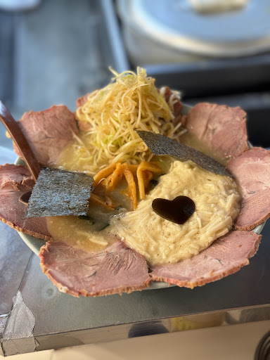 Read moreラーショ(椿)系の風味だが、家系以上に濃厚なスープが特徴で、食べごたえがあり、かなりおいしい。 この日は開店直後で先客1名、自販機でラーメン600円+大盛200円の食券を買い、店員さんに手渡す。店員さんは、何か掛け声のようなセリフとともに食券を受け取った。店員さんは威勢が良いというか、仕草ごとの掛け声が決まっているようで、何かの作業をするたびに店員同士で掛け合いをしているように見える。券を渡して5分もかからず、ラーメンが提供された。 結構大きな丼になみなみと盛られたラーメンは、見るからにボリューミー。これで600円+200円はかなりリーズナブル。ラーメンの見た目は椿系そのもの。トッピングは椿系の様式に則っているのか、薄切りチャーシュー2枚、ネギ、メンマ、わかめ、板海苔5枚(実際は3枚か?)。メンマは少し辛みをまぶしてあり、そのままで酒のアテになりそうだ。そして相当な脂。カウンター越しに調理を見ていたが、背脂チャッチャどころではなく、湯切りに山盛り取った座布団様の背油塊を、お玉でごしごしとしごいて丼に落としていた。そんな脂まみれの丼を提供する折、店員さんは「まずスープをどうぞ」と言っていたので、レンゲでスープをすする。白い油脂の花を散らされたスープからは、少しだが動物系の香りを感じる。そんな香りこそあれど、とろりとしたスープには嫌味や臭み、くどさはあまり感じられずうまい。風味は椿系に近いが、とろみは椿系にはない特徴で、昔どこかで食べた記憶がある口当たりだった(乱暴だった頃の大阪の天下一品だったかな?)。麺はラーショ系に似たストレート麺。ストレートでありながらも、スープのとろみのおかげで、うまみや味がよく絡んでくる。途中まで食べ進んだところで、味変にトライする。卓上の調味料は、胡椒、ニンニク、豆板醤、辛子高菜、特製の酢。まずは胡椒で味を締める。粒胡椒を挽くタイプなので、がりがりするたびにシャープな香りが鼻を衝く。色とりどりの粒胡椒が挽かれて丼に落ちる。落ちたスープをすすると、濃厚さが抑えられ少し、キリリとしていた。しかししばらく食べ進むと、強力な濃度の中に胡椒の風味が埋没してしまう。次にニンニクを投入。これもスープに飲まれてしまいそうだったので、チャーシューの上に落としておいて、少しずつレンゲでスープに溶きながら食べてみる。この変化は食べ親しんだいつもの味だ。そしてうまみが強まったように感じられる。次に辛子高菜を試してみる。博多ラーメンではおなじみの薬味だが、ラーショ系、家系では見かけない。少しだけ取ってスープになじませ、麺に絡めて食べてみる。結構な辛みである。これは好みか習慣かもしれないが、この味には紅ショウガを合わせたい。そう考えると、このスープの中には博多ラーメンや村山ホープ軒の風味も隠れているのかもしれない。まさに普段の好みが前に出てきてしまっている。そして酢も試してみる。少しだけレンゲに入れて味を確かめると、結構マイルドでうまみのある酢だ。気の利かないラーメン屋にある、角ばった酢ではなく、まろみのある酢とでもいうべきだろうか。レンゲに取ったスープに投入すると、うまみが前に出て、コクがマイルドに感じられるものになった。でもこれはあまり好みの味ではない。このスープは濃厚のままのほうがうまい気がする。いろいろ味変を楽しんだが、このスープはいつの間にか薬味の味をすべて飲み込んでしまっているようだ。それほどに元から相当な濃度になっているのだろう。結局以後に口に残ったのは、一口目で感じた濃厚な味だった。そして最後、スープをまくって丼を開けると、店員さんが「よい食べっぷりお見事です」のようなことを言っていた。これもこの店の様式なのだろう。掛け声はいろいろあるが、大声で騒ぎ立てるわけではないので、気にはならなかった。某地方ファミレスの「さわやかです」という、謎のあいさつと似たものを感じた。 今日はデフォルトのラーメンだったが、次回はとろろや味噌などちがう味も試してみようと思う。 駐車場は店の角を曲がった奥に10台分程度あり、表通りからよりも裏通りからの...