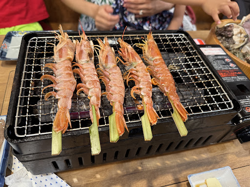 🌊 What Makes It Special? • Beach Hut Vibe with Tabletop Grills Each table has its own grill where you can cook your own fresh shellfish and seafood, just like at a beach BBQ. The interior gives off a casual, seaside shack atmosphere — perfect for a fun and interactive meal. • Signature Dish: Grilled Crab Miso in Shell Their famous kani miso koura yaki (grilled crab paste in the shell) is a must-try — rich, umami-packed, and served sizzling hot. • Japanese-Only Ordering System Orders are placed through a touch panel, which is mostly in Japanese. Some English support is available, and staff are usually helpful if you ask.