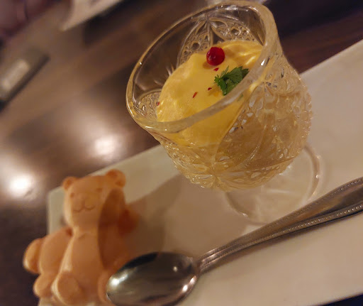 ◇お通し(クマのモナカにかぼちゃのムース) 愛らしいクマ型のモナカを手に取り、そっとその中にかぼちゃのムースを忍ばせる。口に運ぶと、モナカの繊細なパリッとした食感が軽やかに弾け、続いて甘みとコクが見事に調和したムースが広がる。童心をくすぐるビジュアルと、洗練された味わいのギャップが楽しい一品。遊び心の中に職人の技が息づき、食卓を軽やかに彩るお通し。