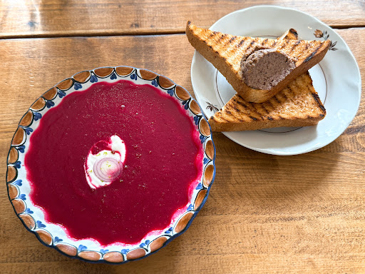 高円寺にあるビストロカフェ . 〈注文品〉 【A】:1000円 . 〈メモ〉 高円寺に住むグルメ友達と朝活をしようとなり訪問したお店 25年8月.土曜日の朝9時半過ぎに伺い、店内満席状態が続くといった状況でした . ・A モーニングはスープ/パン/ドリンク2種類といった構成でAセット・Bセットの2種類から選べる形式 今回は冷製ビーツとスイカのスープ+ココナッツクリーム、レンズ豆とナッツのペーストのパンが組み合わさったAセットにてオーダー ドリンク2種はホットチャイ/オレンジジュースでの注文です . ◯ 冷製ビーツとスイカのスープ+ココナッツクリーム 大皿に注がれたスープは鮮やかな赤紫色が目にも鮮やかで視覚的にも惹かれる色合いで素敵 こちらは一口含むとまず広がるのはビーツの土っぽさを含んだ甘さで、その後にスイカの瑞々しさと爽やかさがふわりと広がる夏の朝にぴったりな仕立てとなっていました ココナッツクリームが加わる事で全体に丸みが出て、ほんのりとしたコクがスープに奥行きを与えてくれているイメージ フルーティーでヘルシー、それでいて意外性のある組み合わせとしても楽しめるモーニングで非常に美味しかったです!
