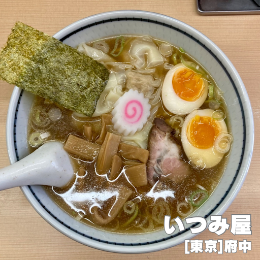 いつみ屋@府中市本町1-7-2 どうも、さぴおです ______________ 🟦煮干しがほっこり効いた心に沁みるわんたんめん!  ̄ ̄ ̄ ̄ ̄ ̄ ̄ ̄ ̄ ̄ ̄ ̄ ̄ ̄ [点数] 86点 ☆4.1 [アクセス] 府中本町駅』(249m) [注文メニュー] わんたんめん玉子入り950円 [並び・システム] 外待ち5人・チケット制 [食材] 動物出汁、魚介出汁、豚チャーシュー、煮玉子、ナルト、海苔、ネギ、ワンタン、中華麺。 [味] 醤油、煮干