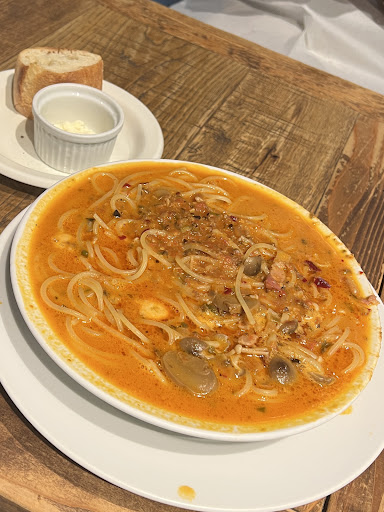 The pasta was a soup-based pasta, and the taste was outstanding to the point where I drank every drop of the soup. It had a perfect blend of garlic, tomato base, mushrooms, and cheese.
