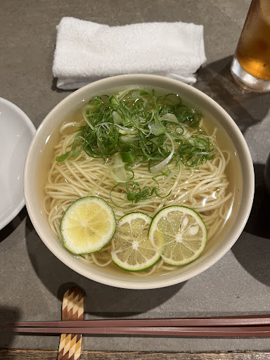 i was desperate to grub on something clean after my long, arduous hair appointment. to my luck, this izakaya was situated right across from the salon and it felt like fate to me. greeted by the three shop owners, i sat at the bar and got a bird’s eye view of the restaurant’s simultaneously quiet yet swift dynamic. this is what i needed, a ginger golden chicken broth to appease myself after my scalp was brutally stinging for 2 hours on end (i made the poor mistake of washing my hair the night before). three individual slices of lime smiled at me from the bottom of the bowl. the wavy egg noodles and slices of scallion cascaded in the liquid like ribbons, and the texture felt the same going into my mouth- springy and delightful. life seemed to come rushing back into my veins again after i finished engorging myself in this dish. i felt alive again, ready to take on the rest of my day and storm out into the streetlights...