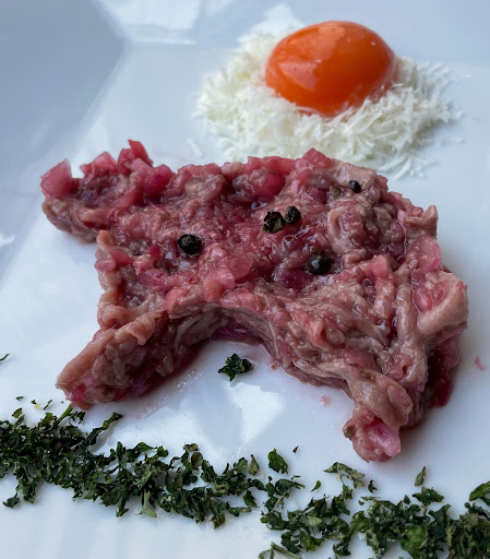 🟢和牛のタルタル(1430円) スクエアプレートに牛🐂シルエットで登場したタルタルは、メルヘンチック🇮🇹 絵本の表紙みたいなかわゆさです❤️ 卵黄の太陽に、大地のグリーン🌱伸び伸び育った牛さんがイメージされます❗️赤玉ねぎの食感と香り豊かな濃いめの味付けタルタルは、ワインが進みます🍷