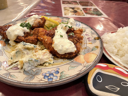 おおー、さくさくな衣に南蛮ソースとタルタルが食欲そそる顔で到着。あ、ライスてんこ盛りでしたw チキンは三等分に切られてるのでフォークだけで食べれます、サクサク衣が甘酸っぱいソースとタルタルのマヨネーズに絡みめちゃめちゃ旨し。地鶏自体も柔らかく仕込まれて食べやすい。 付け合わせはポテトサラダとメインの下に敷き詰められたスパゲッティ。洋食でよくあるタレにスパゲッティ絡めるの好きです。 そんなこんなでパクパク完食。 食べ終わる頃合い見てコーヒーも到着で接客にも隙がない。...