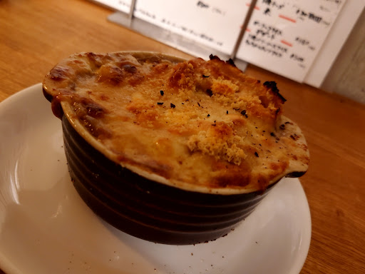 久しぶりに小金井のJikkaで軽呑みしたくなり、行ってみました。白ワインをお供に3皿並べる独り呑み。 1皿目は定番のオニオングラタンスープを頼んでみました。大ぶりの深皿で出てきたスープは粗め細切り玉ねぎがたっぷりで相変わらず骨太のボデイ。そこにチーズ等をかけて仕上げ焼きされたスープは最初から最後まで熱々で、濃厚な旨味を演出してくれました。調理に時間がかかるので、メニューにあれば序盤オーダー必須です。 2皿目も定番の季節野菜のフリット盛り合わせ。仄かに味を加えた衣は野菜との相性が抜群ですし、揚げ具合も上々です。ただ気になったのがソースで、普段ならフリットの旨味を増してくれるのですが今回は重みが残ってしまい具の美味さを少し損なっている印象。ソースについてはブレの範囲だと思うので、重い時は無理に合わせずフリット単独でも良いかも。 〆はパスタ。気分的にはクリーム系、少しサッパリ系にしたかったので黒板からアオサ柚子胡椒を選んでみました。しっかりコクがあるのにアオサがサッパリ感を演出し、柚子胡椒が独特なアクセント、バランスが完璧な〆パスタに満足。 久しぶりでしたが相変わらず料理が美味い。家族連れも多いですし、地域に根付いてくれた...