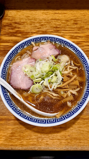 Ginger soy sauce ramen with dried sardines, pork & heaped veggies, served at wooden counters.