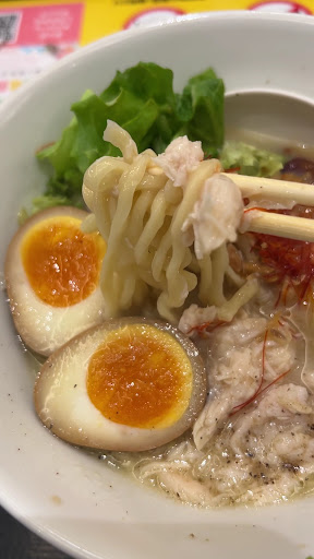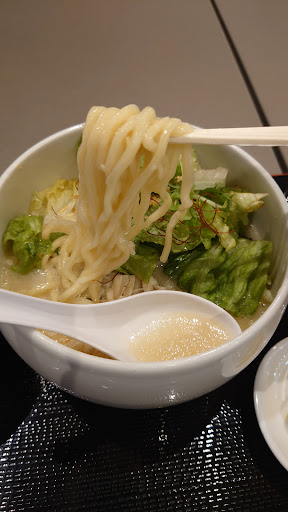 まずはスープを一口すする。 鶏白湯スープというと、かなりドロドロしているものもあるが、こちらはとろみがあるくらいの濃度。鶏ガラの味が芯にあって、奥行きを感じる。