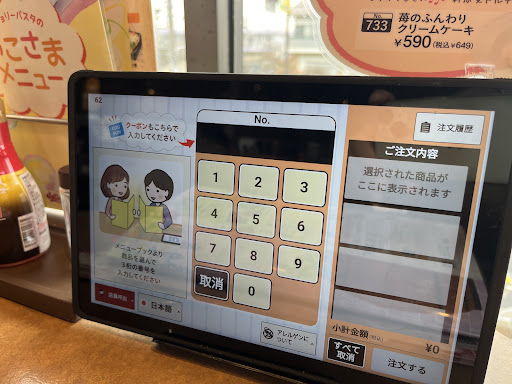 Read more2025.1.2 12:00 交差点、信号機前という立地。 1階が駐車場で2階が店舗ですが階段のみです。 入口右手にタッチパネルの受付があるので、人数を入れると席の番号札が出て来ます。この紙の札は最後に会計に使うので取っておいてください。 書かれている番号とパネルに表示されてる同じ番号の席に行きます。 メニューはメニューブックのみで、注文はタブレットにメニューの番号を入力します。 水とお手拭きはドリンクバーの所にあります。セルフ式です。 パスタ専門店となってますが、基本的にスパゲッティで、追加料金でフェットチーネに変更出来るだけです。専門的なパスタ料理は有りません。 メニュー的には創作スパゲッティ、種類は多いです。ピザやリゾット等もあり、平日にはランチもあります。 金額はセルフの部分が多いファミレスと考えると高めの設定な気がします。 会計はセルフレジ。店員がやる時と自分でやる時と日によって違います。 コード決済、クレカ、交通系IC、色々あります。 ポイントはVポイント、楽...
