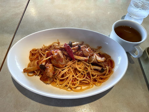 日替りパスタを注文。 先日TVで「乾麺から茹でるので時間が掛かる」と紹介されていた通り、提供まで約10分掛かったが、そのつもりで行けばそれほど気にはならない。店員さんの応対も丁寧で全く問題ない。 安価なランチに何を求めるつもりもないが、1口食べて味がとても薄いと感じ、軽く混ぜてもソースが圧倒的に足らないためすぐにテーブルにあった粉チーズとペッパーオイルを足した。しかし食べ進めると下にトマトソースが予想以上に溜まっていて、最後は大量に余ってしまった。 普通にパスタを作ったらまず麺をフライパンから皿に移し、残ったソースや具を後から上に掛けるのでこのようにはならないし、飛び散るとイヤなのでトマトソース系はグチャグチャとかき混ぜられない。どういう作り方をしたのか謎だが、パスタ専門を謳うなら改善の余地はあるだろう。 また、店舗中央の席に座ったが、ちょうど真上に天吊ポスターがあり、エアコンの風でヒラヒラ動いて、写真の通りテーブルの照明が明るくなったり暗くなったりするのが煩わしい。せっかくの料理も影がチラついて落ち着かないので、改善...