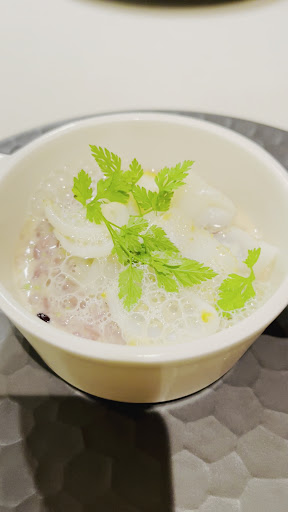 つぶ貝のリゾット 一部に黒米を使用して、そちらから出た色素で色がついている。イタリアンパセリとアンチョビを使ったバターと合わせてる。アサリから出た出汁を泡にしてソースをかけてる ◼︎グジュール(シュー生地にチーズを混ぜて焼いたもの) サンマのリエット(コンビーフ状のもの) チーズの旬のサンマの風味がよく合う。ワインやお酒によく合います。 ◼︎根セロリのスープ 上にトリュフがかかっており、トリュフとセロリの良い香りがテーブル上に広がります。 アミューズの後味をサッパリとしたものにして、次のお料理を楽しみに待つことができます。 ◼︎北海道産ニシンのマリネ 塩レモンがけ 下には2年熟成させたメークインを潰したものを使用。横に添えてあるサワークリームとキャビアとお好みで付けて食べるとまた違った味を楽しめます。 滑らかで甘みのあるメークインとクセのないニシンのマリネの相性が◎ サワークリームとキャビアをつけるとまたクリーミーで更に上質な味へと変化します。 ◼︎フランス産のセップ茸のソテーにスペイン産のプーレ・ジョンヌ(皮が黄色の鶏)の旨みのしっかりしたムネ肉に火入れをしっとりとさせたもの。 ソースは2種類。ソース...