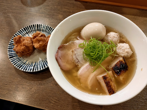 Read moreまず卓上の調味料が少ないと「おっここはラーメン1杯に自身があるのだな」と思う。 調味料や薬味がたくさん卓上に並ぶ店もいい。酢、ラー油、にんにくその他薬味にお新香。頼んだラーメンを好きにカスタマイズできる嬉しさがある。創作における「想像の余地を残した」結末のように。 しかし楓は違う、卓上には割り箸とレンゲ以外には中挽き胡椒のみ。明らかに「好みが分かれたとしてもこの『胡椒』以外は不要」と言わんばかりに。まさしくラーメン界の覇道を征く王者の風格である。 地鶏そば塩を注文した。塩か醤油か問われ、おすすめを聞いたら迷わず「塩」と返答が得られたからだ。 その他に特製トッピングとから揚げ2個を券売機で購入した。 椀が届いてスープをひと啜り、鶏を推していながら1発目は煮干しの端正なダシが印象に残った。 それ以降は終始鶏の滋味深い味わいに包まれた。 むしろ煮干しっぽい味は最初しか感じなかった。 麺は細い縮れ麺。乳化していないスープに良く合った。 トッピングの九条ネギも食感が良い。香りはそこまで強くないものの、歯ごたえで1杯の中で彩りを与えてくれていた。 しかしなんだろう、3口目以降もただただ鶏だ。なんか少し飽きる。味わいも、特製トッピングの腿の炭焼き(?)、なんこつつくね、鶏胸チャーシューも相まってなんかずっと焼き鳥を食べている気分である。焼き鳥の肉汁に麺と具を漬けて啜ってる感覚に等しい。 唐揚げを間に挟んだのが私の悪手だったのかも知れない。茴香系のスパイスが容赦なく効いた唐揚げはサイドメニューにしておくには惜しいほどパンチが強く、スープと特製トッピングの具材を圧倒して味を塗り潰していた。 それに具材一個一個は美味しいけれどちょこっと炭焼き(?)の鶏の黄色い脂身が気になった。 ここまで様々述べたが、鶏を主体のラーメンとしてとても美味しい出来栄えである。
