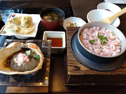 かに釜めし膳の釜めしはセイロでも良かったかなと思うぐらいの量。天ぷらは牡蠣2個、かぼちゃ1個、レンコン1個。 焼いたカニ味噌はすごく美味しい。全体的に天ぷらも釜めしももちろん美味しい。腹の膨れ具合としてのコスパは悪い。女性や高齢の客も多く、そんなに食べない層には適した量だと思う。 抹茶わらび餅は、わらび餅に黒蜜をかけて美味しい。