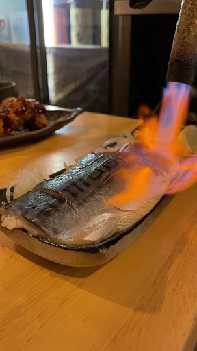・豪快炙り〆さば 目の前でバーナーで炙ってくれる迫力満点のパフォーマンスが楽しめる炙り〆さば。溢れ出す旨みに、程よい脂が堪らなく日本酒と相性抜群。