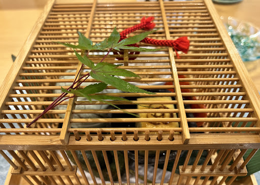 涼しげな籠に入った前菜が数種類。 ・ミニトマトのワイン煮 ・鰊?と茄子の煮物 ・そうめん瓜の胡麻和え ・よもぎふの田楽 ・鱧入り卵焼き ミリン風味 ミニトマトは皮も剥いてあり、ワインの程よい風味が染み込んでました。 魚(鰊かな?)と茄子の煮物はしっかりとした少し甘めの味付けでビールも進みます! 珍しいそうめん瓜の胡麻和えはさっぱりしつつ、胡麻のクリーミーさと良く合います。 よもぎふはもちもちした香りの良い蓬と甘辛い味噌で、定番です! 卵焼きはいつもと違って少しミリンがかかっていて甘めでこれもまた楽しめました!