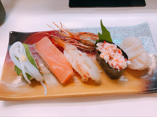 まずは、真イカ、鯵、鯖、大海老、鉄火巻、貝の3点盛り、