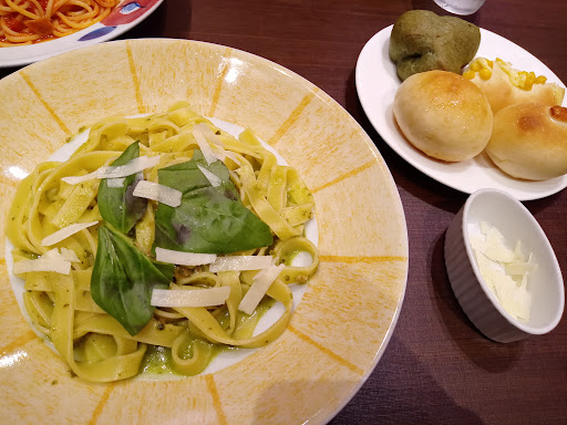 Read more家族で昼食で訪れました。 店内は照明が少し暗めで落ち着いた内装でした。 私はジェノベーゼパスタをフィットチーネに変更し、サラダ、パンの食べ放題のCセットを注文しました。麺はモチモチでフレッシュバジルとガーリックのソースが物凄く合っていて美味しかったです😋 パンはセルフでテーブルから持ってくる形式でしたが、種類が豊富で時間で時間でテーブルに出るパンが変わるため何度も取りに行く楽しみがありました✨...