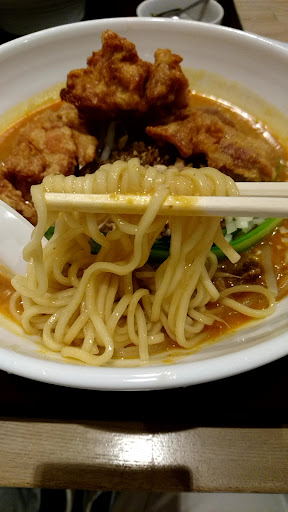 巣鴨駅近く、担々麺好きとしては気になっていたお店。表の看板を見ると、なんと唐揚げ担々麺がある!?ということで入店。 13:00過ぎなので数人のお客さん、注文して5分もたたずに出来上がり、早いこれは助かる。 唐揚げはレンゲにから溢れる大きさ!しかも少し時間経過し、スープにつかっていてもベタつかない唐揚げの衣、これは考えてありますね~ 味はナッツ挽き肉チンゲン菜のシンプル担々麺、間違いなく旨い。 内装も綺麗な感じで女性店員の方も程よい元気さの接客。 気持ちのよいランチタイムを過ごせました(これ大事)。 あと唐揚げトッピング150円は味たま120円と比べても安いのでは、半ライスもランチタイム無料。 ゼリーはコーヒーゼリーでした。