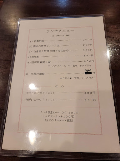 1)特製酢豚@950円 2)海老の唐辛子ソース煮@950円 3)白身魚と野菜の柚子風味炒め@950円 4)油淋鶏@850円 5)四川風麻婆豆腐@850円 6)今週の麺類(何だったかメモし忘れた)@900円 ※すべて税別 2番を注文。