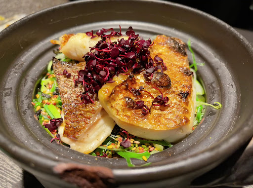 ▪️土鍋ご飯 ・タイ飯(真鯛、九条葱、むかご) 選べる土鍋ご飯はこちらをチョイス。 真鯛の切り身を豪快に乗せて炊いた土鍋ごはん。 むかごが小さいながらもほっくりと存在感を放つ。 九条葱の風味がとても良い。